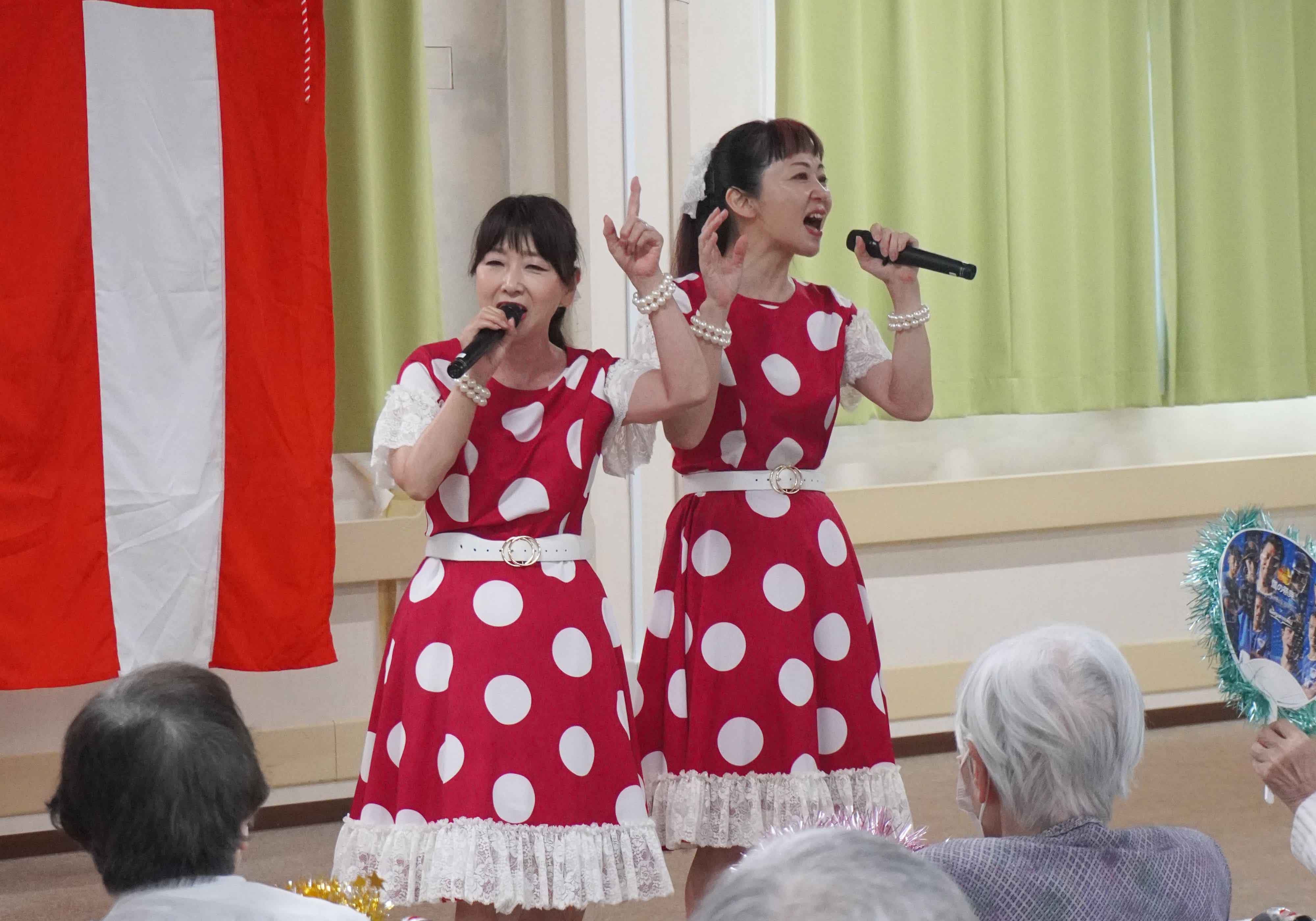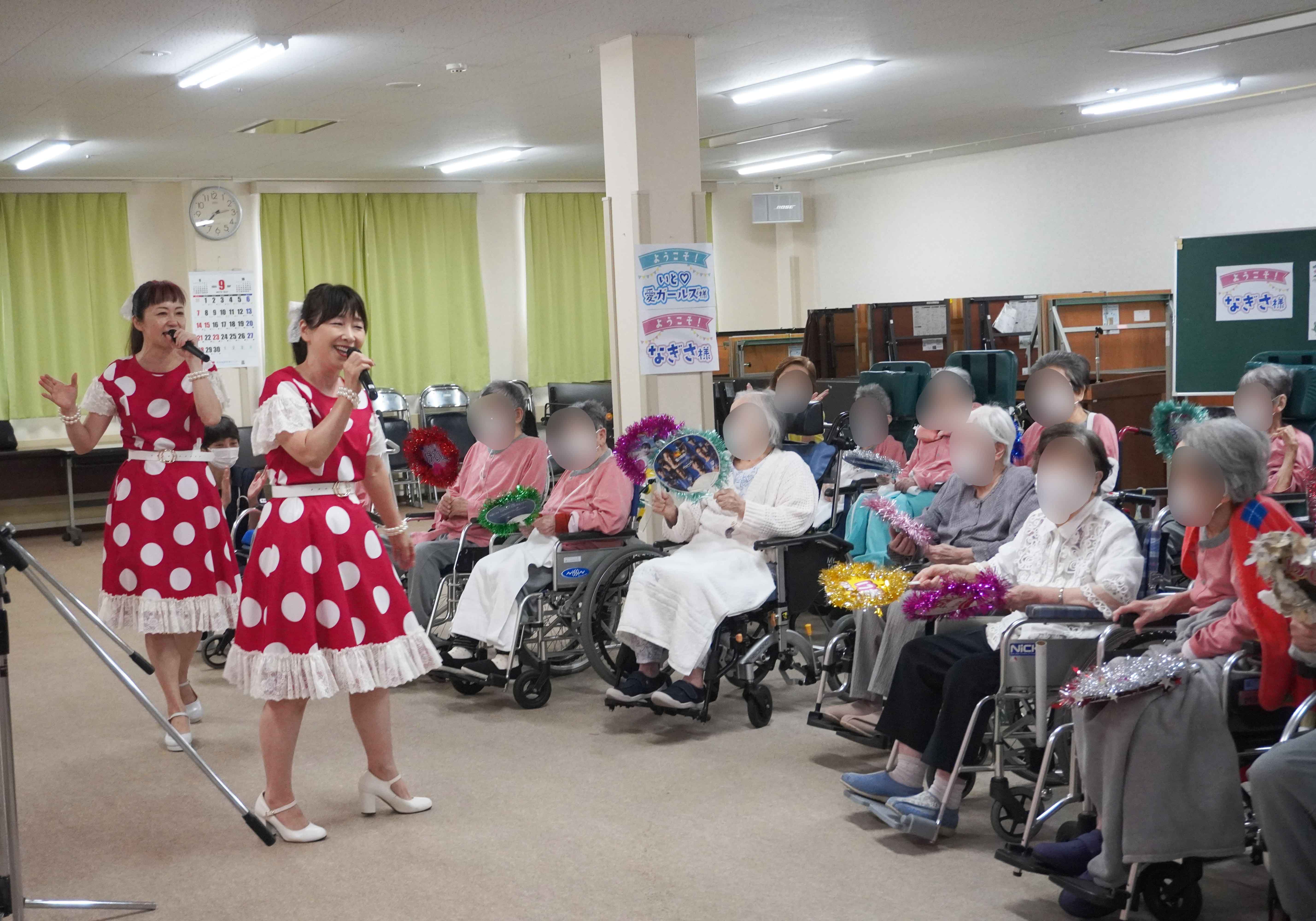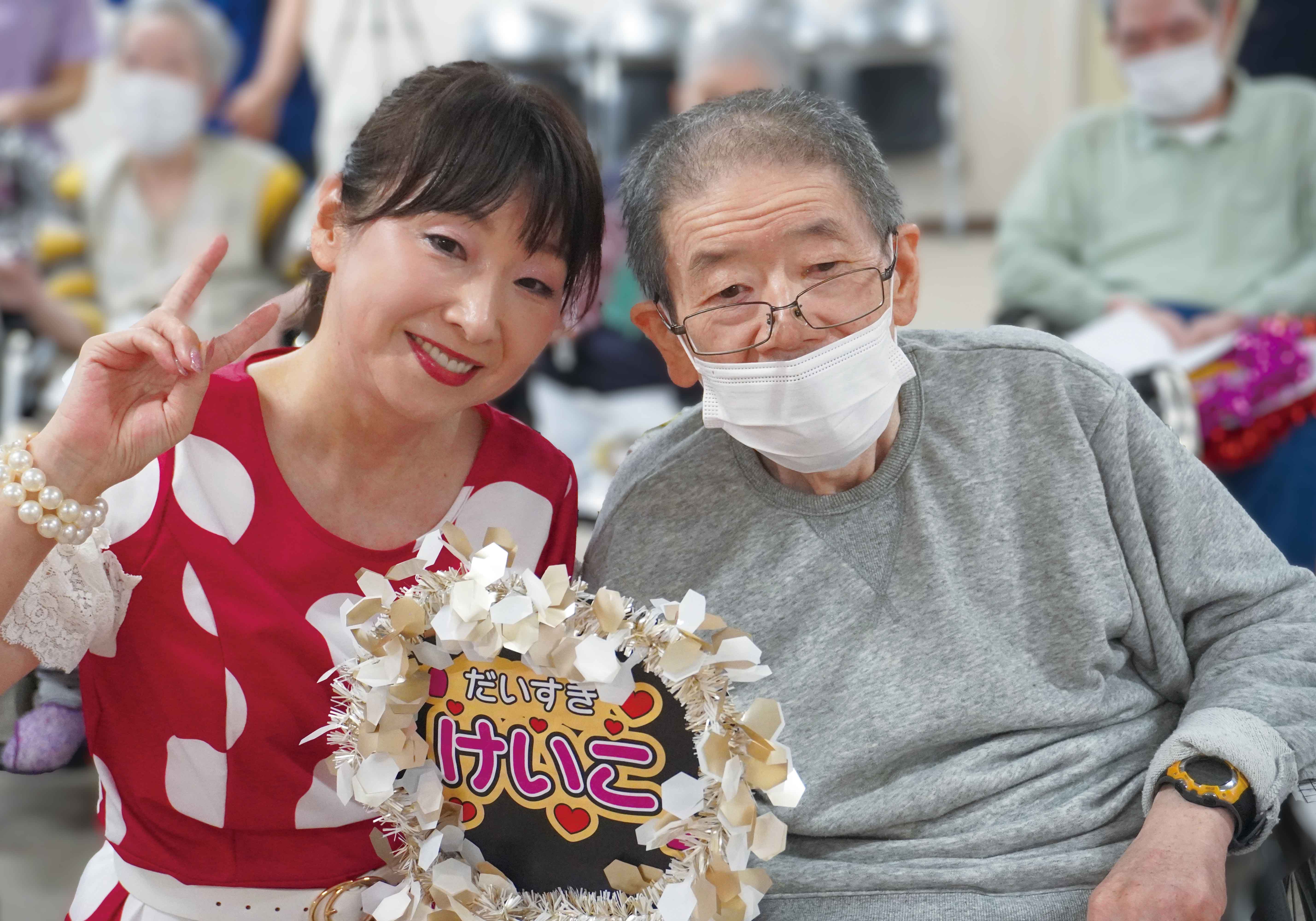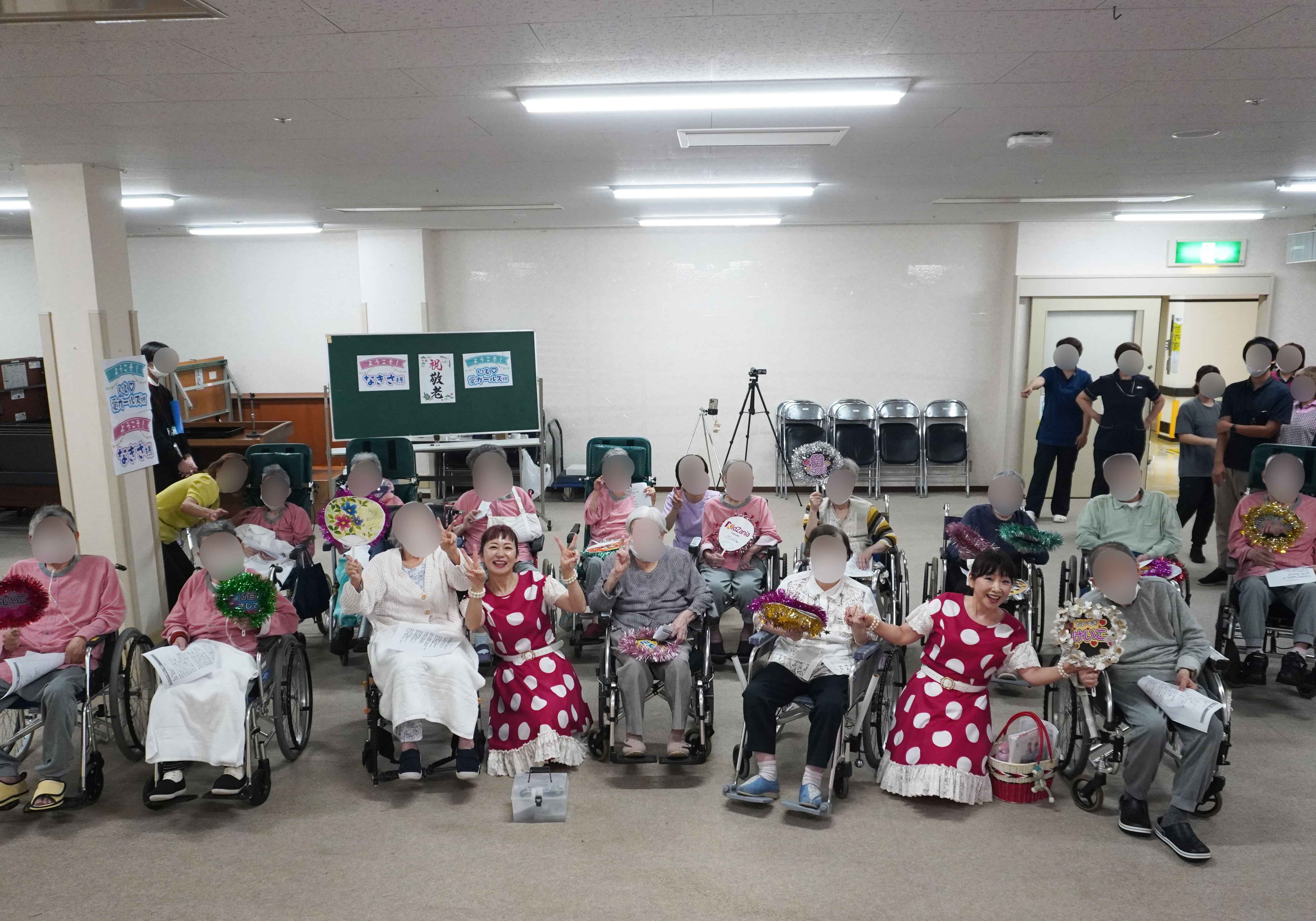 職員手作りの“推し活うちわ”を手に、懐かしの昭和歌謡曲メドレーを楽しみました。