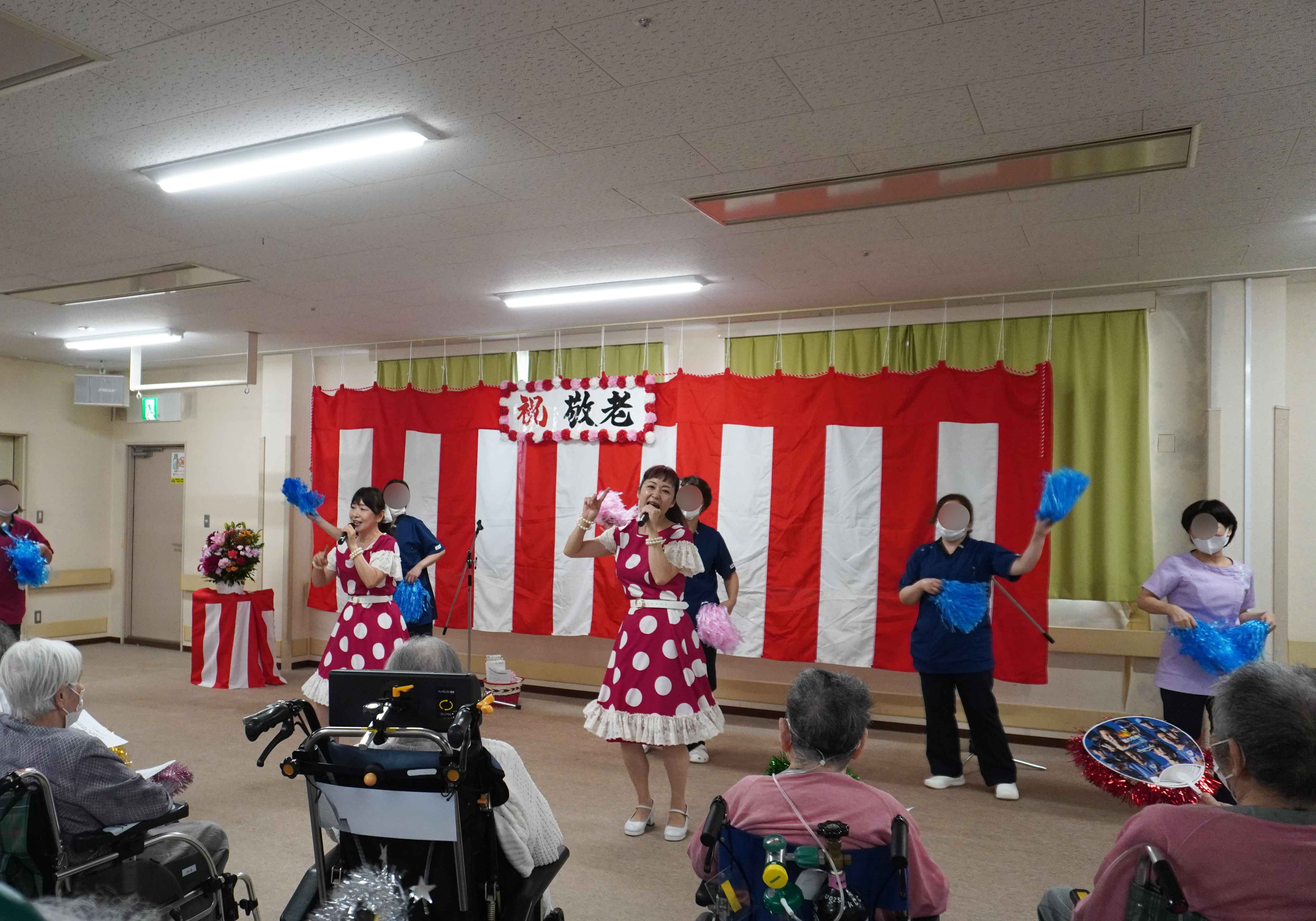 途中、職員もバックダンサーとして参加し、会場は笑顔と拍手に包まれ、大盛況の敬老祝賀会となりました。