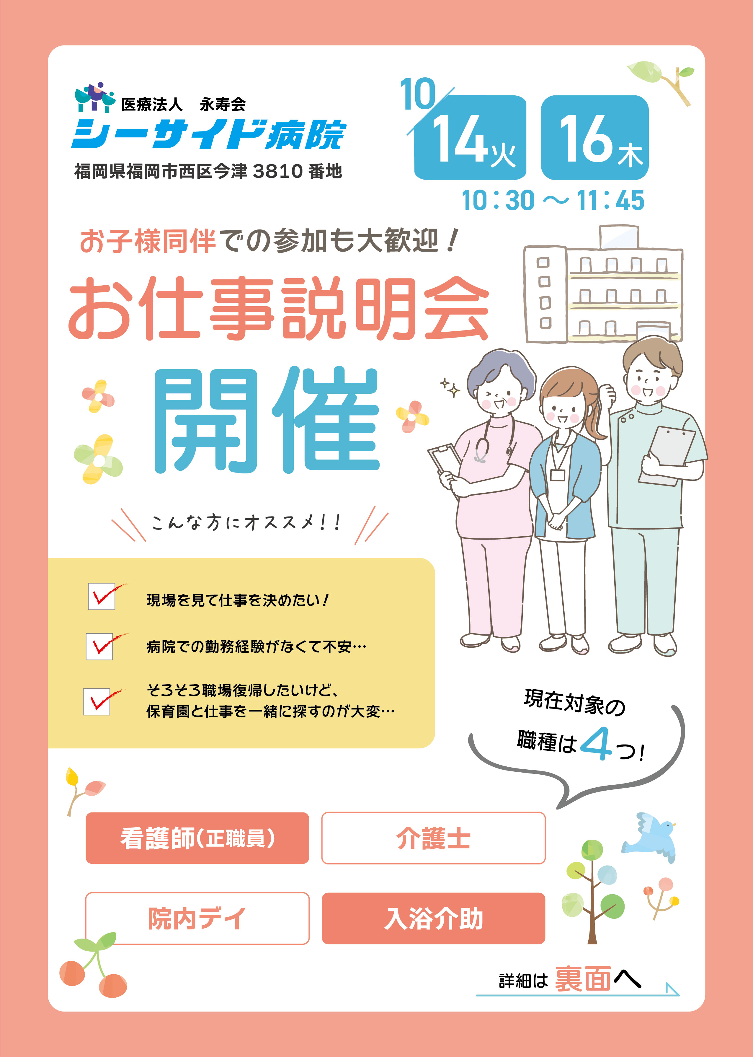 子育て中の方、プライベートの時間を大切にしたい方、シーサイド病院で自分らしくいきいきと働いてみませんか?