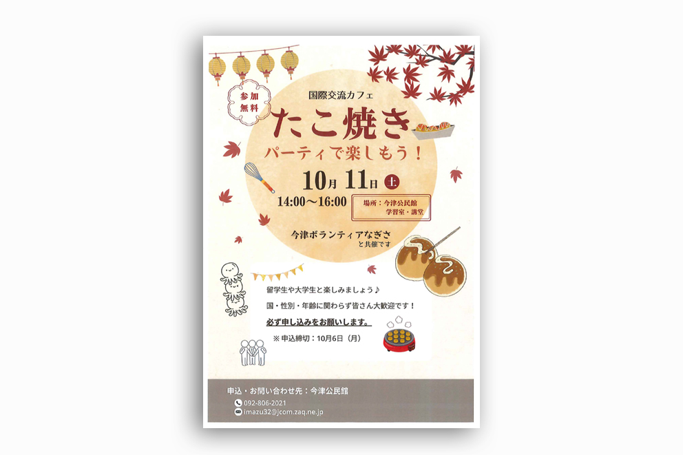 今回は今津公民館と九州大学の学生有志、そしてボランティア団体『なぎさ』のみなさんの協力により「たこやきパーティーで楽しもう!」という名目で開催されました。