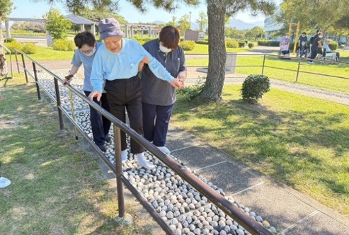 季節の花を眺めたり、様々な形や大きさの石が足裏を刺激する「健康遊歩道(リフレッシュロード)」に挑戦したり・・・!!