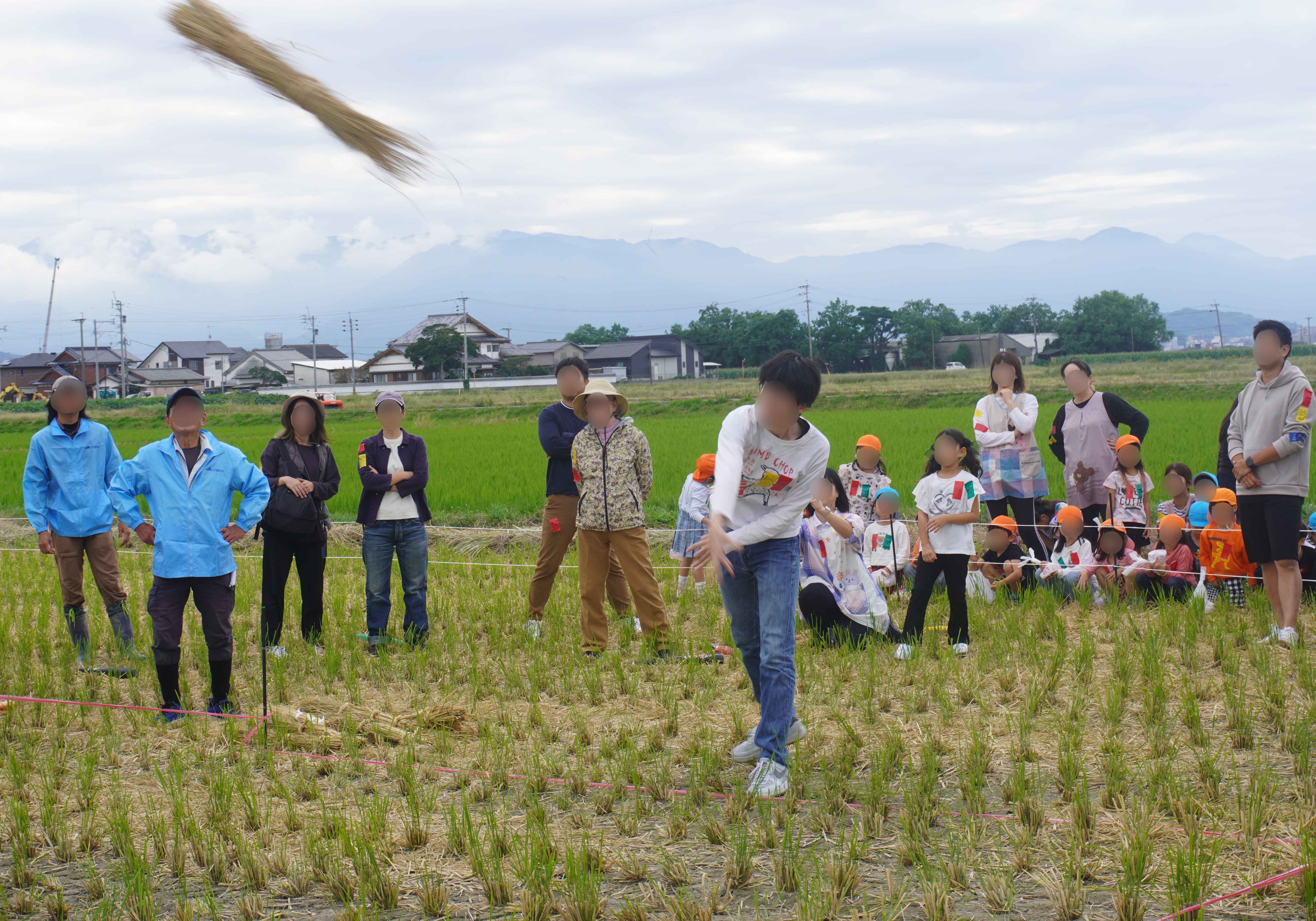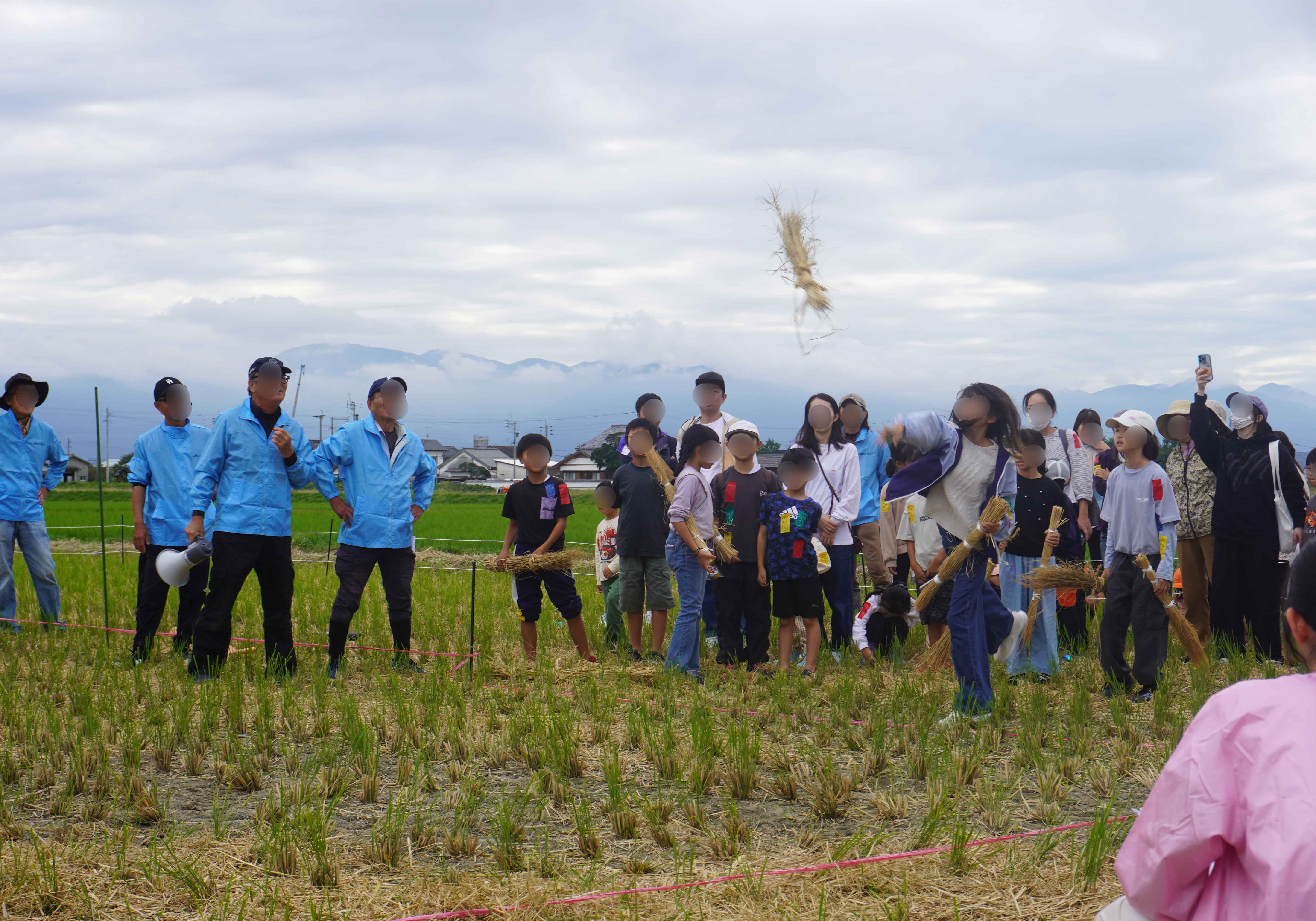 稲刈り後の乾いた田んぼの上で、「わら輪投げ」「わら束投げ」「障害物競走」「宝探し」の4種目が行われます。