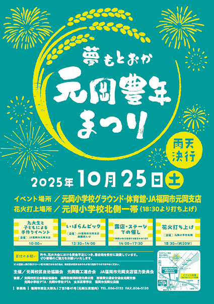 元岡豊年まつり2025ポスターこのお祭りでは、日中はJA福岡市元岡支店や元岡小学校で「いぼらんピック」や露店・ステージイベントが行われ、夜には元岡小学校北側の田園地帯から花火が打ち上がります。