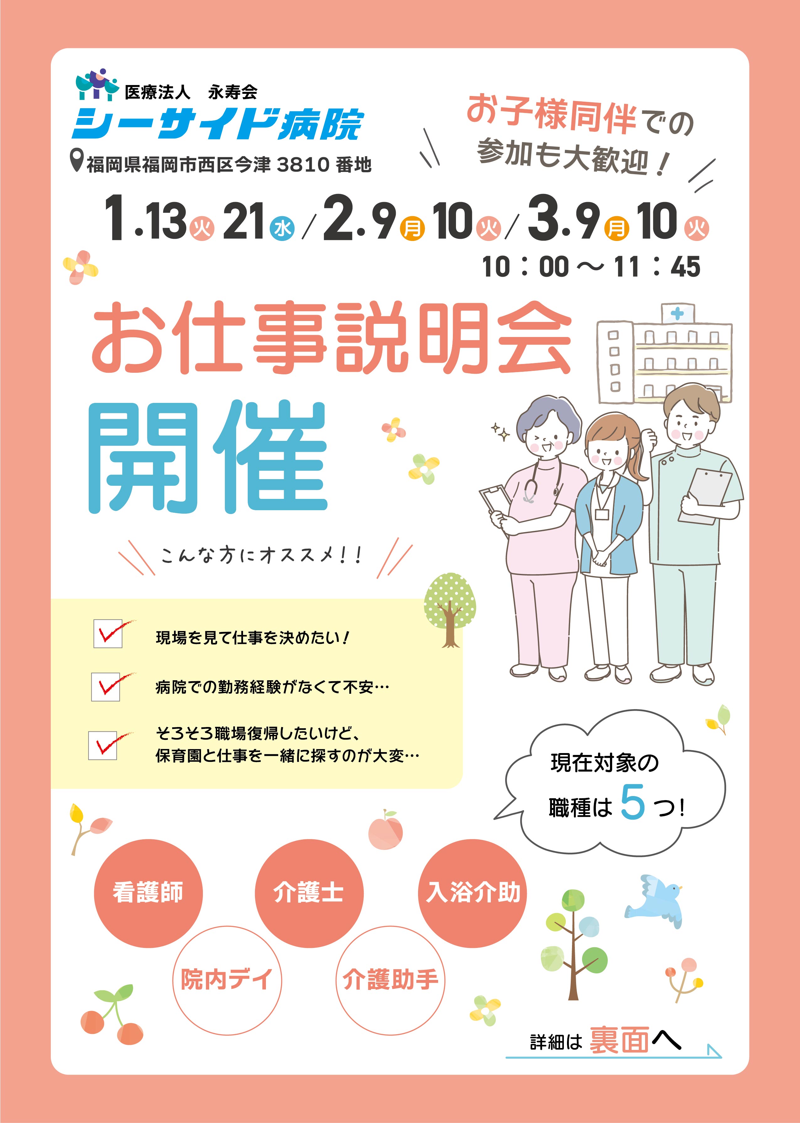 子育て中の方、プライベートの時間を大切にしたい方、シーサイド病院で自分らしくいきいきと働いてみませんか?