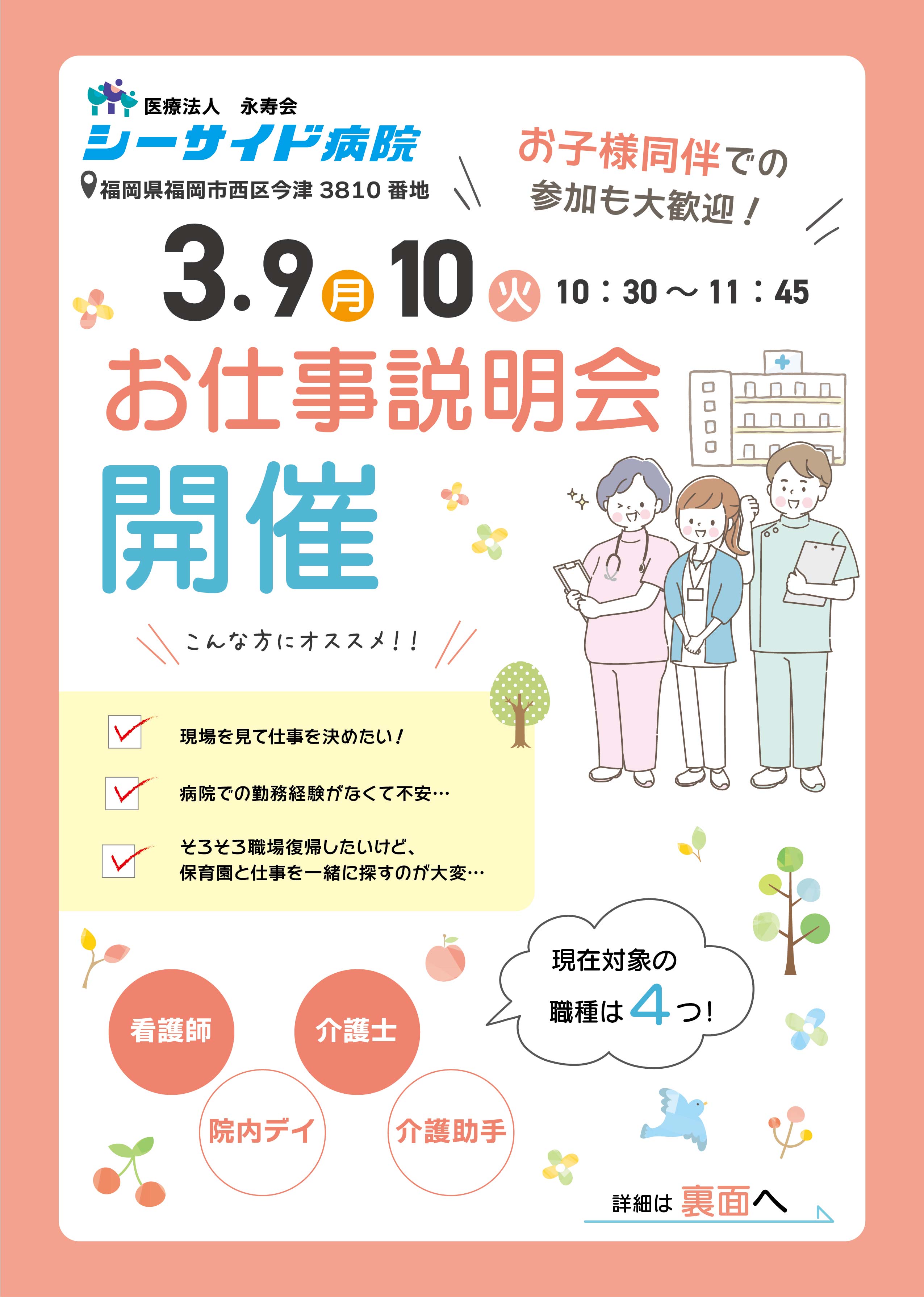 子育て中の方、プライベートの時間を大切にしたい方、シーサイド病院で自分らしくいきいきと働いてみませんか?
