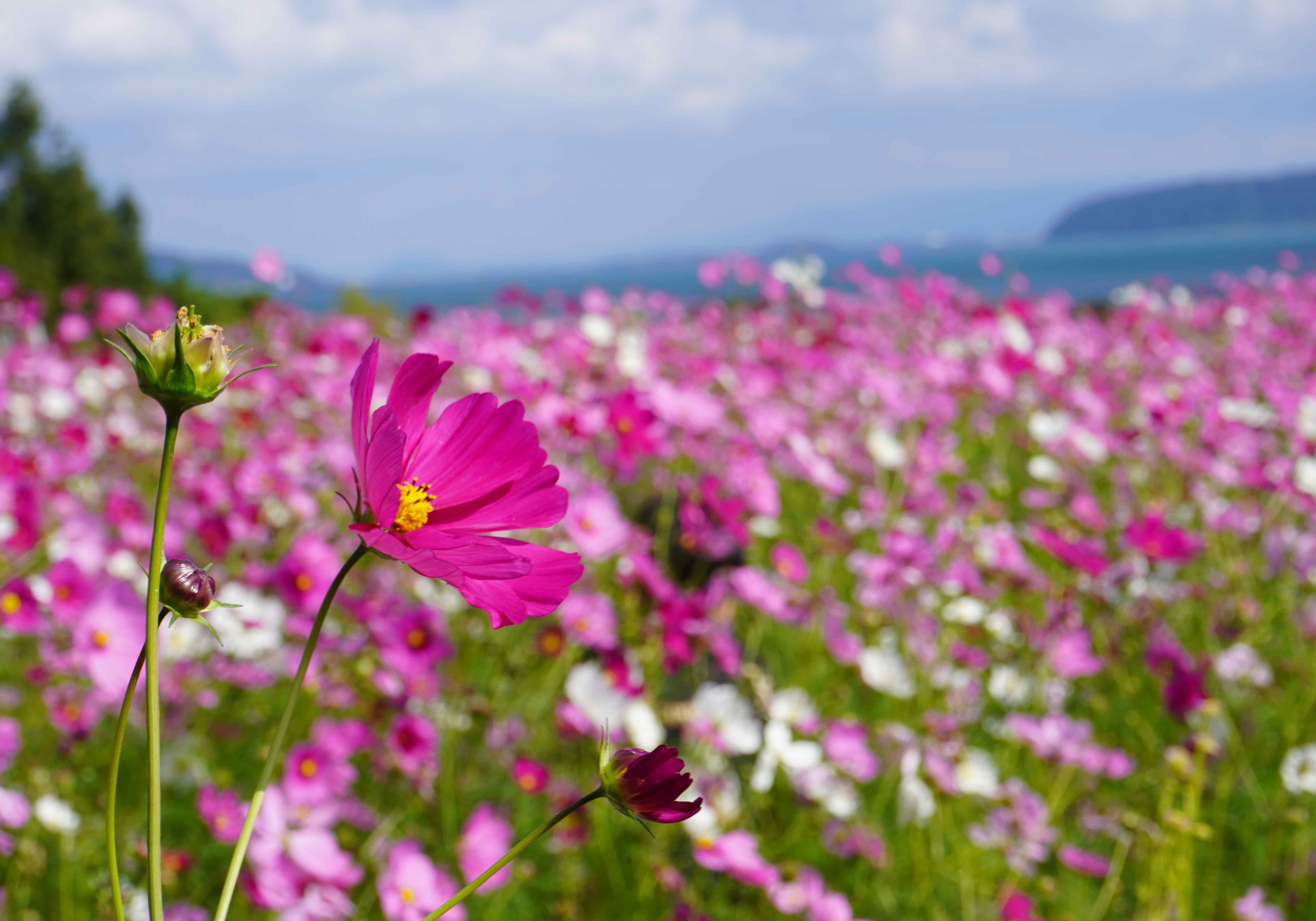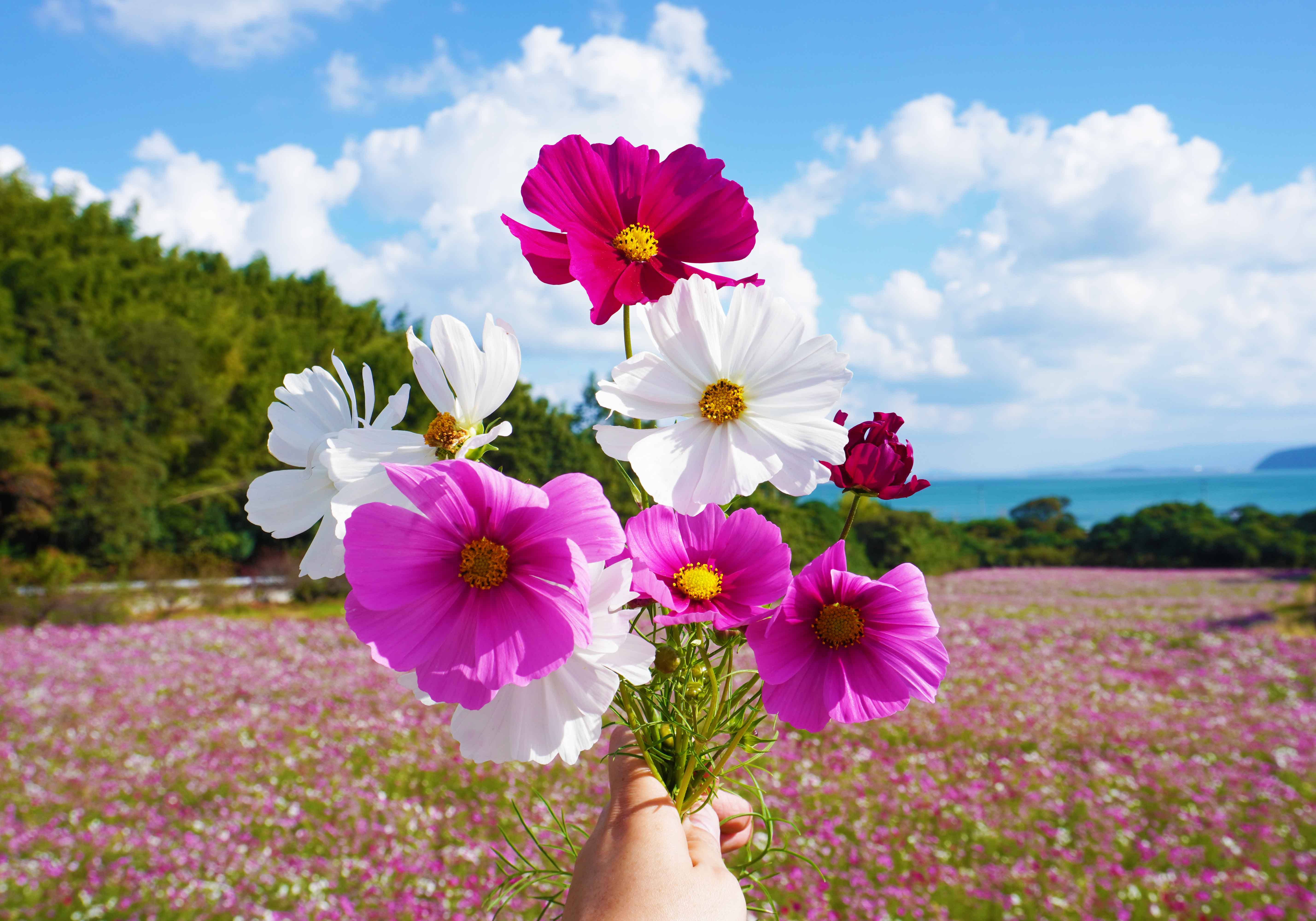 博多湾を望む今津中田コスモス広場で、コスモスの摘み取りイベントが開催されました。