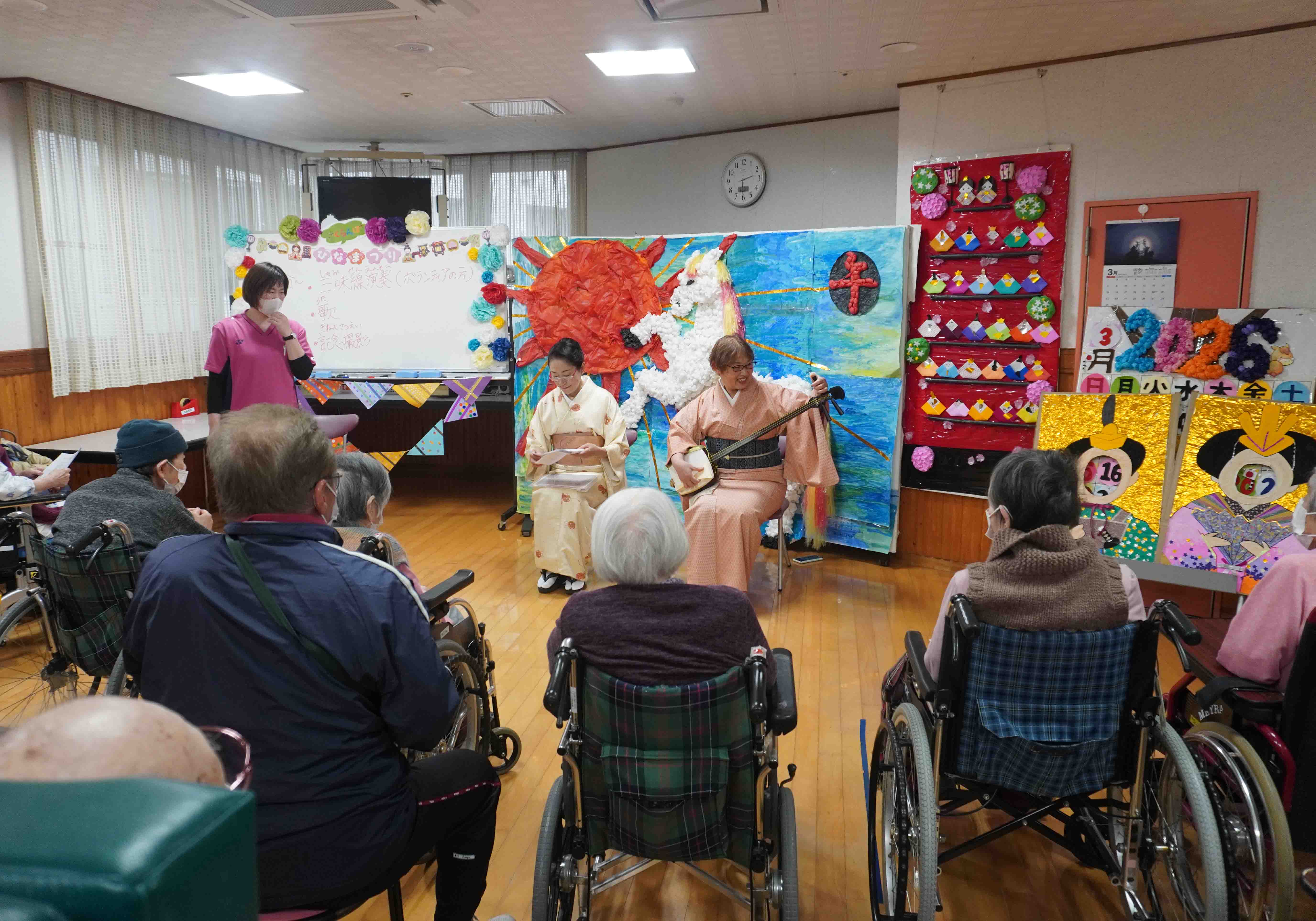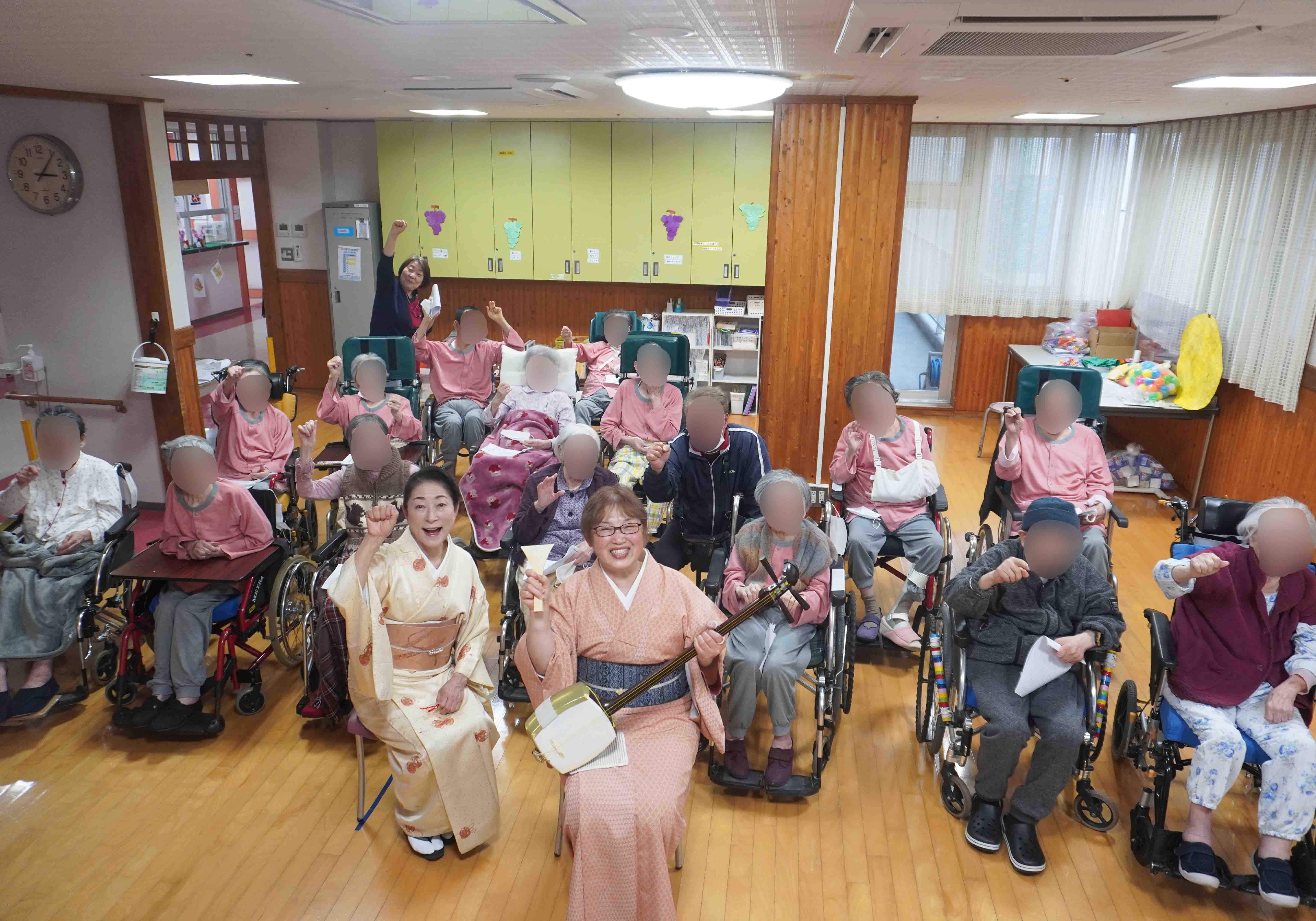 三味線のやさしくも力強い音色が響くと、利用者の皆さんは思わずうっとり。