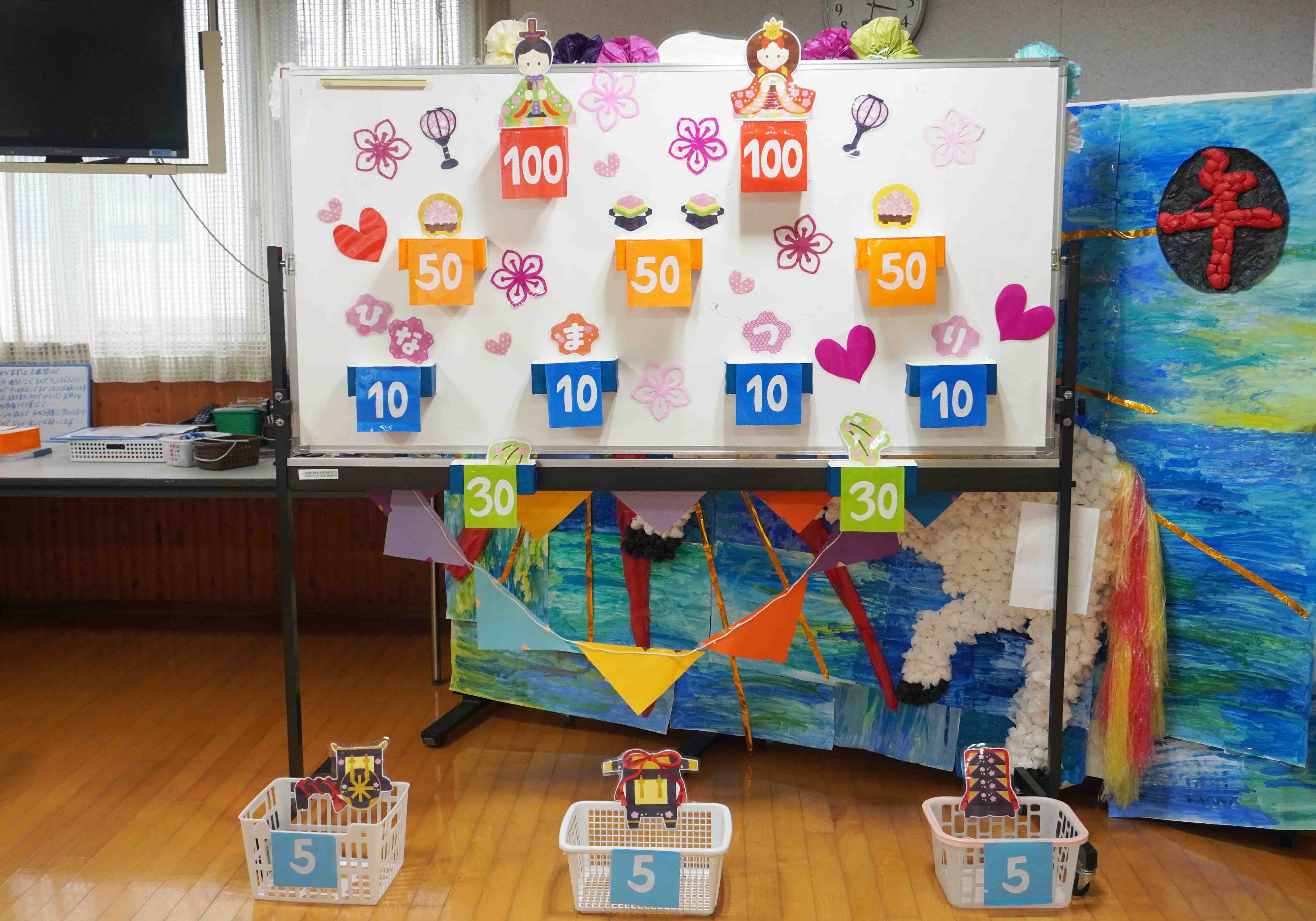 カラーボールをひなあられに見立て、点数の書かれたカゴをめがけて投げます。