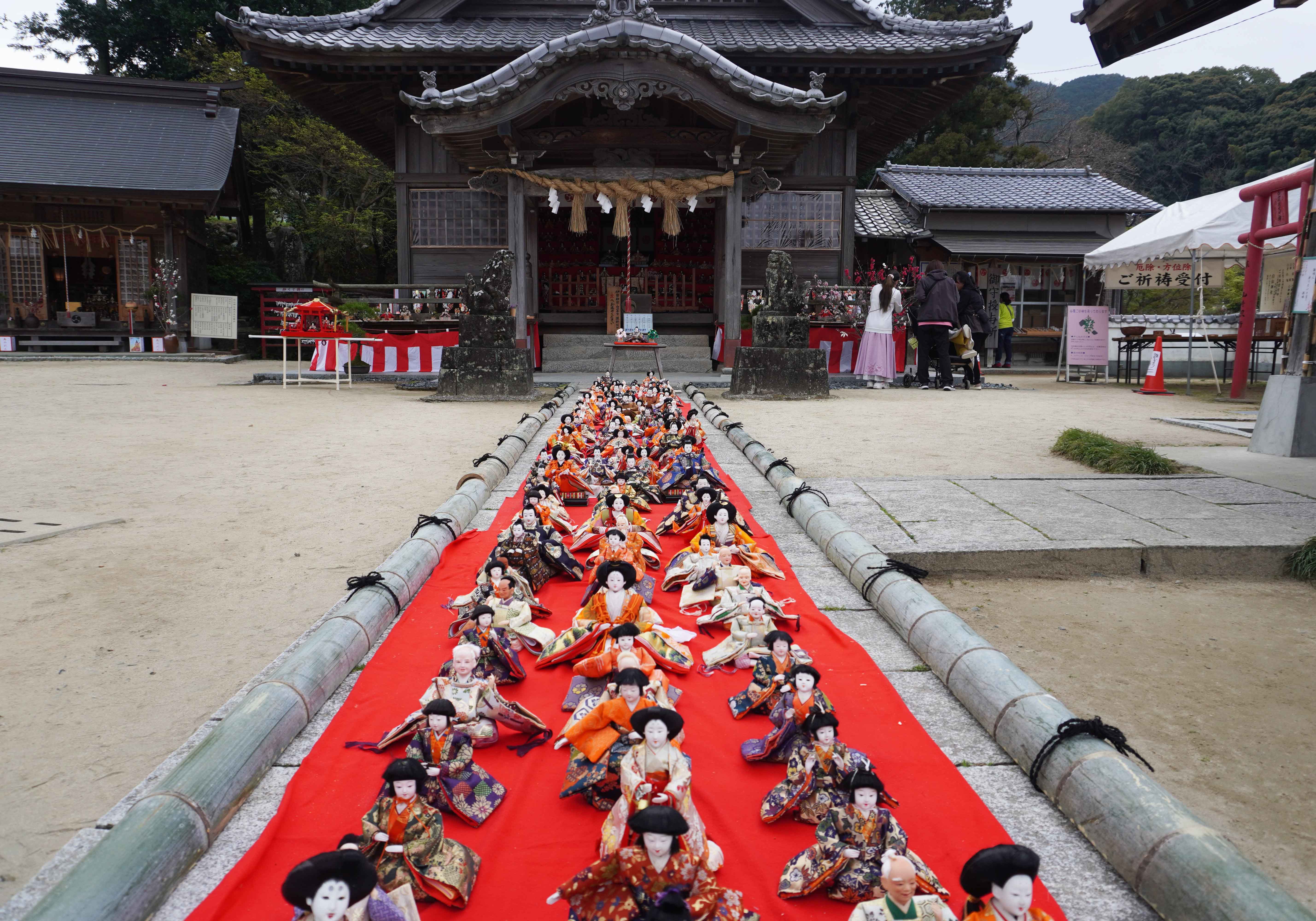 『英のれん』さんは2024年まで糸島市志摩師吉のギャラリーでひな祭りを行っていましたが、昨年より旧暦の桃の節句に合わせ、神社境内での展示を行っています。