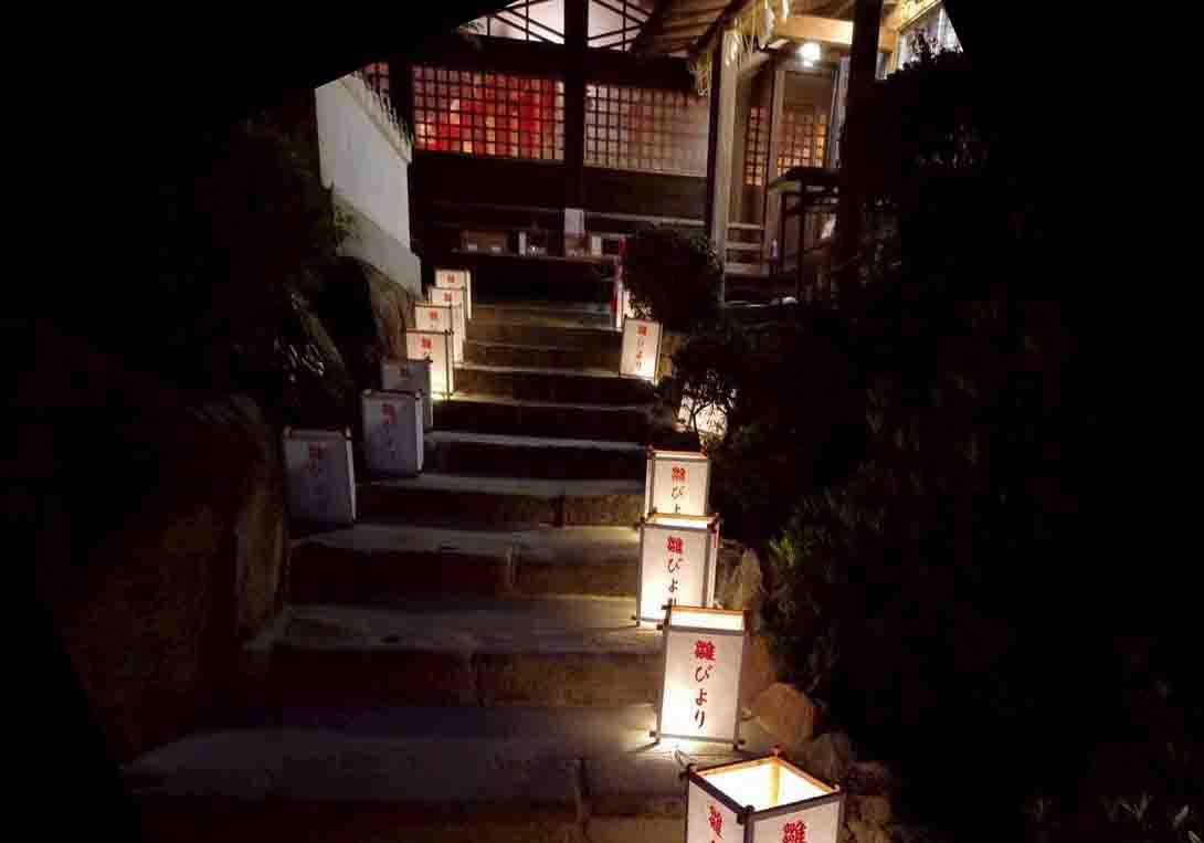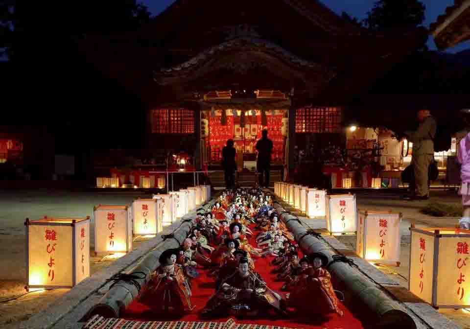 境内に飾られた灯籠の灯りが、お雛様たちをやさしく照らし、幻想的な雰囲気を演出します。