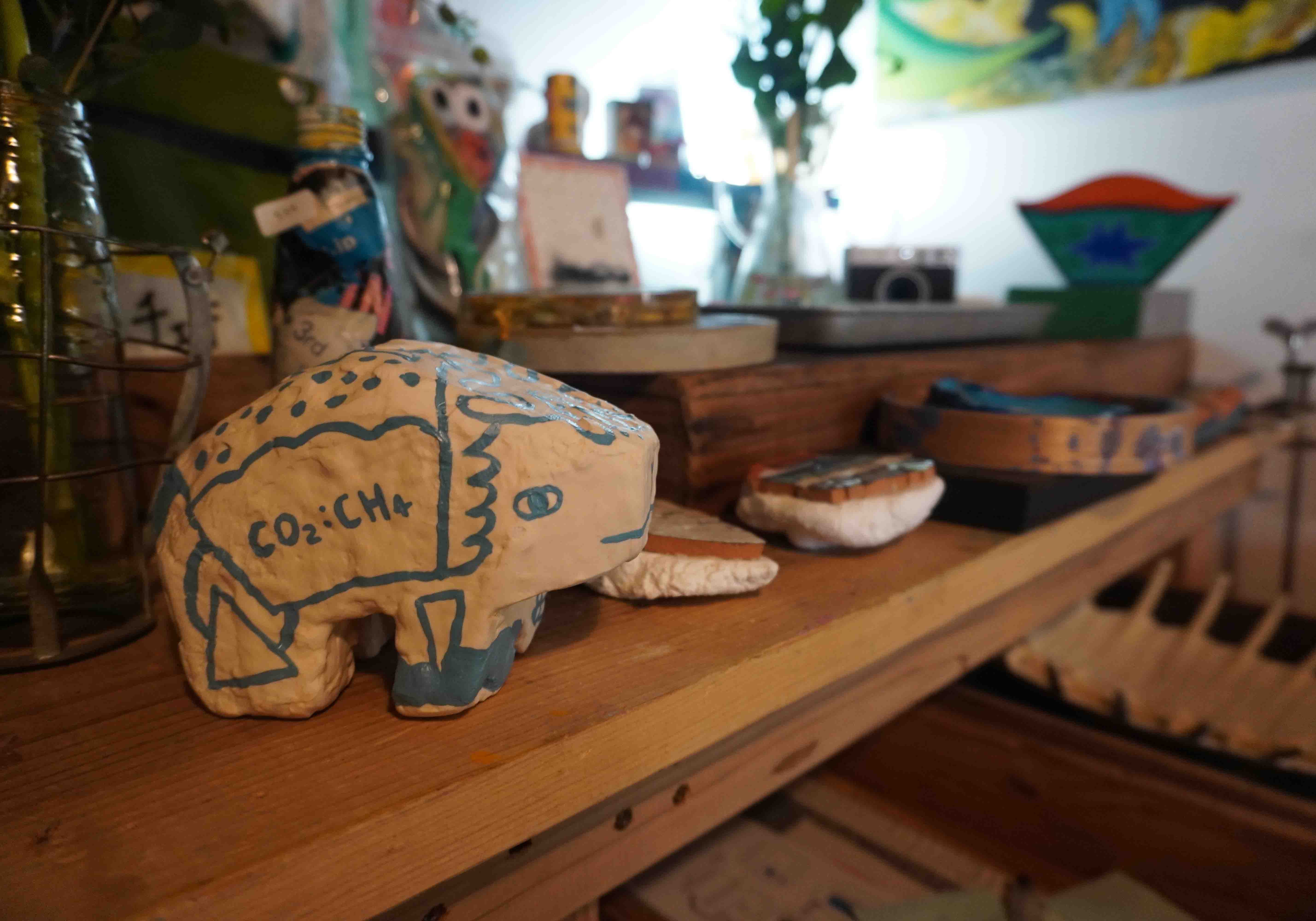 現在も当院で使用していますアトリエには、しばたみなみさんのコレクションや作品が数多く並べられていました。